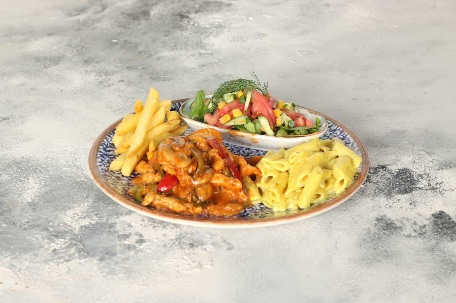 180gr tavuk parçaları, mantar, mısır, kremalı paris sos, patates kızartması, pesto soslu makarna